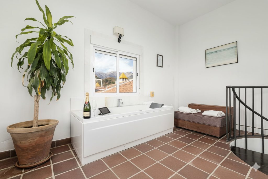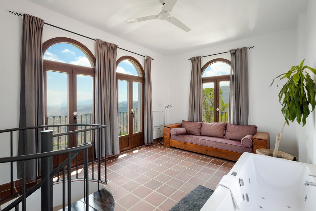 Máxima exclusividad. Es la habitación más espaciosa con 50 m2 dividido en tres niveles. Posee el torreón subiendo la escalera de caracol donde aparte de una preciosa vista panorámica del pueblo encontrará una bañera de hidromasaje.
